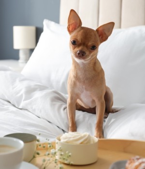 Koniecznie używaj dołączonej zawieszki na drzwi, aby obsługa Dworzyska wiedziała, że w pokoju jest zwierzę.